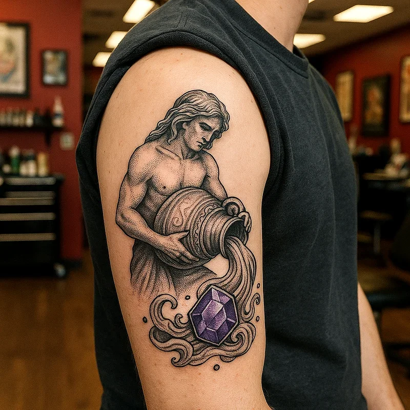 February Aquarians can celebrate their birth month by incorporating stunning amethyst elements into their zodiac tattoo design. This purple gemstone adds a pop of color while symbolizing the wisdom, clarity, and spiritual awareness associated with your sign. Artists can create incredibly realistic crystal formations using various shading techniques, making the stone appear to emerge from your skin. You might choose to have amethyst crystals pouring from a water bearer's urn or surrounding your constellation in a celestial arrangement. The purple hues complement the traditional blue tones of Aquarius perfectly, creating a harmonious color palette that's both meaningful and visually appealing. Some designs even incorporate geometric crystal shapes for a modern twist on this birthstone tribute, appealing to those who prefer contemporary aesthetics.