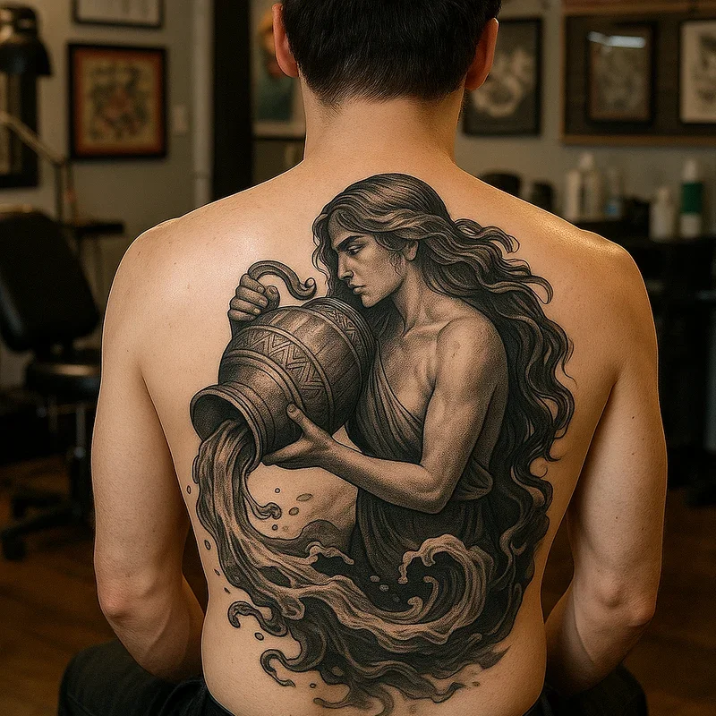 Transform your back into a canvas for an elaborate Aquarius masterpiece that combines artistic ambition with zodiac symbolism. This placement offers the largest continuous space for complex designs, allowing your artist to create detailed scenes featuring water bearers, celestial landscapes, and flowing water elements. You might envision a goddess pouring starlight from her vessel or an abstract interpretation of Aquarian energy radiating across your shoulders. The back placement allows for privacy when needed while offering dramatic reveal potential in social settings or at the beach. These large-scale pieces become true works of art, often taking multiple sessions to complete but resulting in breathtaking tattoos that showcase both your commitment and your sign's significance. The investment in a back piece reflects the depth of your connection to your Aquarius identity.