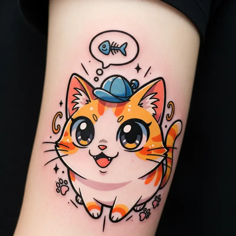 Who says cat tattoos need to be serious? Cartoon and anime-style cats bring playfulness and joy to feline body art. From Japanese kawaii cats with huge eyes and tiny bodies to Disney-inspired aristocats, these designs celebrate cats' silly side. Popular choices include Sailor Moon's Luna, Studio Ghibli's Cat Bus, or custom cartoon versions of your own cat with exaggerated features. Some people create comic strips showing their cat's daily antics, while others choose single cartoon portraits with speech bubbles containing inside jokes. The simplified style of cartoon cats makes them perfect for smaller tattoos or building larger collections over time. Bright colors, bold outlines, and expressive faces make these tattoos instant mood boosters. They're particularly popular among younger cat lovers or anyone who sees their cat as a source of daily entertainment and wants their tattoo to reflect that joyful relationship.