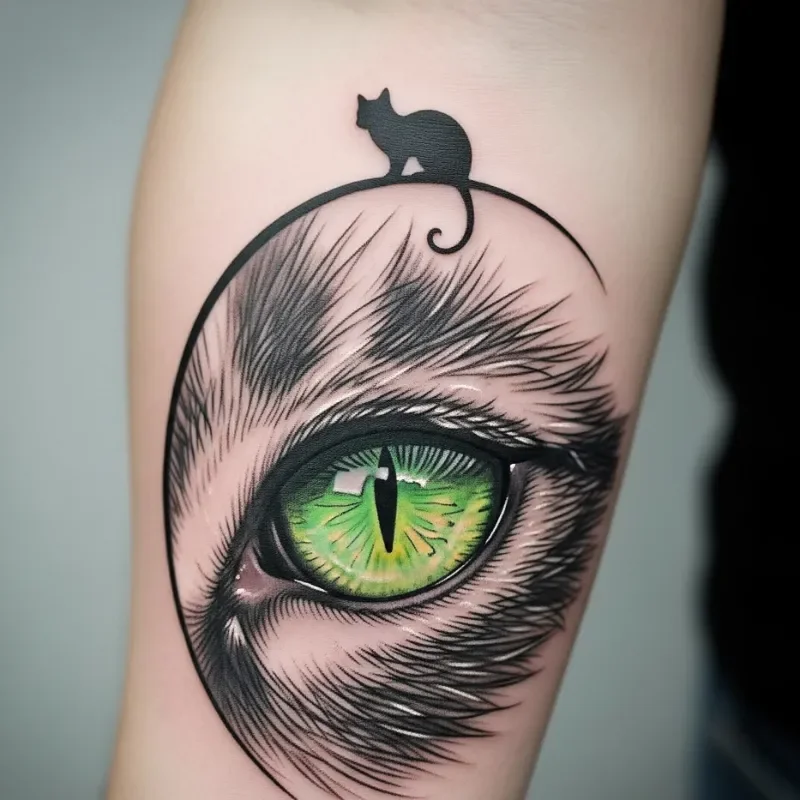 Cat eyes hold entire universes, and close-up eye tattoos capture this mesmerizing quality permanently. These designs focus solely on one or both eyes, showcasing the unique colors, patterns, and expressions that make cat eyes so captivating. Realistic versions might feature your cat's specific eye color, from golden amber to deep green or striking blue. Artists can capture the distinctive pupil shapes, from narrow slits to full circles, and include details like the reflective tapetum lucidum that makes cat eyes glow. Some designs incorporate cosmic elements within the iris, showing galaxies or nebulas, while others add decorative elements like geometric frames or floral surroundings. Single eye tattoos create mysterious, striking pieces, while pairs of eyes can be positioned to appear always watching. These tattoos work especially well for those who've been mesmerized by their cat's gaze and want to capture that hypnotic quality forever.
