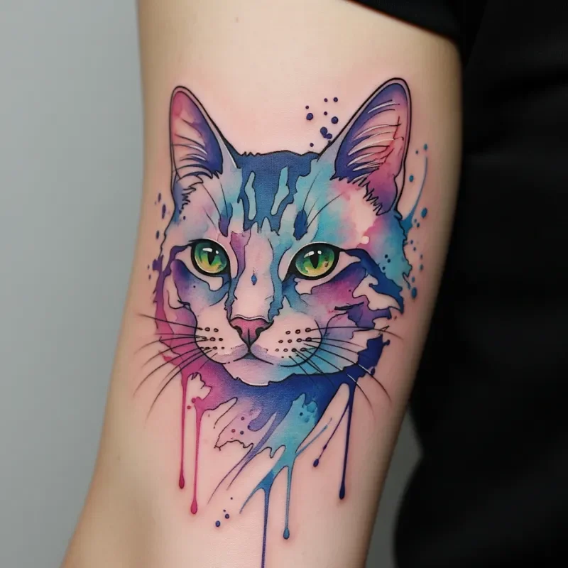 Watercolor cat tattoos bring an artistic, dreamlike quality that transforms your skin into a living canvas. These designs use splashes, drips, and color bleeds to create cats that look painted rather than inked. Imagine your cat's silhouette filled with vibrant purples, blues, and pinks that seem to flow and merge like actual watercolors. Some designs feature realistic cats with watercolor backgrounds, while others go fully abstract with cats suggested through color and movement alone. The technique works especially well for capturing playful cats mid-pounce or graceful cats stretching. Artists might add paint splatters around the design for that authentic artistic feel. While some worry about watercolor tattoo longevity, skilled artists know how to layer colors for lasting vibrancy. These tattoos suit creative souls who see their cats as living art and want body art that reflects that whimsical perspective.