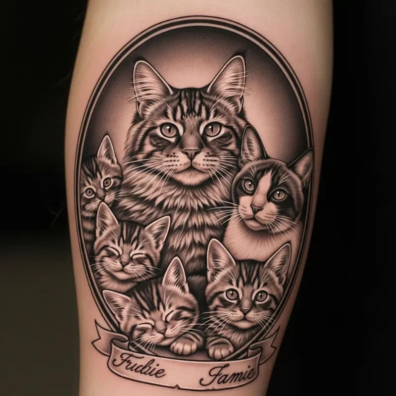 For those blessed with multiple feline family members, group portraits create heartwarming tattoos that celebrate the whole clowder. These designs arrange multiple cats in creative compositions that show their relationships and personalities. Some stack cats vertically like a totem pole, while others show them interacting naturally: grooming each other, sleeping in a pile, or sitting in descending size order. Each cat can be depicted in their unique colors and markings, making identification easy. Popular arrangements include cats looking out a window together, sitting on tree branches at different levels, or forming shapes like hearts or mandalas. The challenge lies in balancing detail with clarity, ensuring each cat remains distinct. These tattoos often become ongoing projects, with new cats added over time. They perfectly capture the chaos and joy of multi-cat households, creating permanent family portraits that showcase each personality.