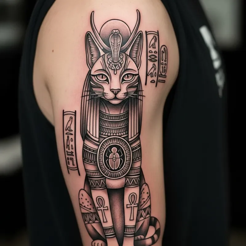 Honor cats' divine history with Egyptian-inspired tattoos featuring Bastet, the cat goddess, or hieroglyphic-style felines. These designs connect modern cat love with ancient reverence, creating pieces rich in symbolism and history. Traditional depictions show cats with elaborate headdresses, jewelry, and ceremonial dress, while modern interpretations might blend Egyptian elements with contemporary style. Ankh symbols, Eye of Horus designs, and pyramid backgrounds enhance the theme. Some people choose full Bastet figures, while others prefer Egyptian-style profiles of their own cats. Gold accents (represented by yellow ink) add authenticity and luxury. Hieroglyphics spelling out cat names or meaningful words create personalized touches. These tattoos suit history buffs, spiritual seekers, or anyone who agrees cats deserve worship. The formal, stylized nature of Egyptian art translates beautifully to tattoo work, creating pieces that feel both ancient and timeless.