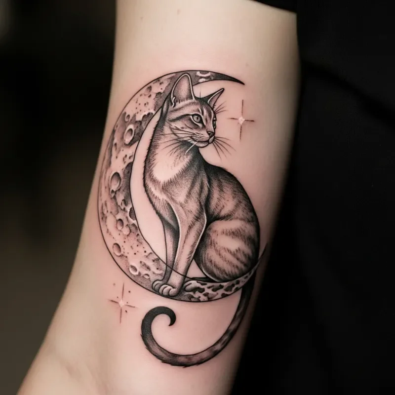 The mystical connection between cats and the moon creates enchanting tattoo possibilities that blend natural and supernatural elements. These designs often feature cats sitting on crescent moons, silhouetted against full moons, or playing among stars and lunar phases. Black cats work particularly well with moon imagery, creating that classic witchy aesthetic many cat lovers adore. Some designs show cats howling at the moon (because why should dogs have all the fun?), while others depict peaceful scenes of cats sleeping on moon crescents like celestial hammocks. Adding elements like stars, clouds, or night-blooming flowers enhances the nocturnal theme. Popular styles range from realistic to illustrative, with some incorporating sacred geometry or mandala patterns into the moon. These tattoos speak to cats' mysterious nature and their historical association with magic, making them perfect for those who see their cats as mystical companions.