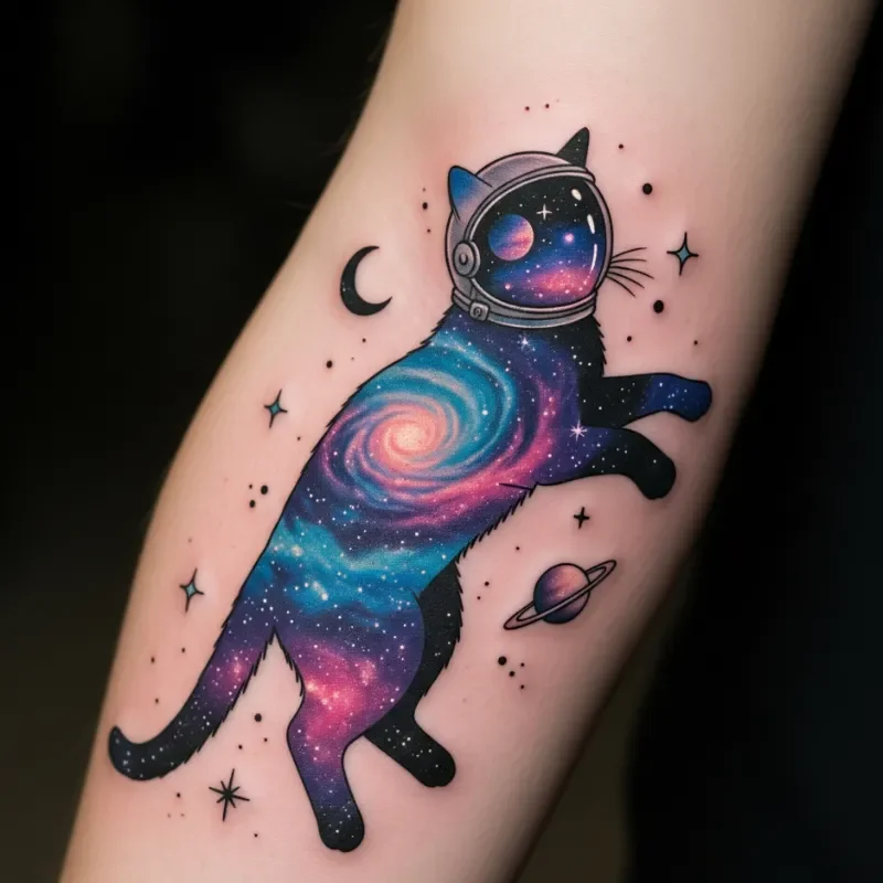 Blast your cat love into the cosmos with space-themed cat tattoos that are literally out of this world. These playful designs show cats as astronauts floating through space, riding rockets, or exploring alien planets. Popular elements include cats in space helmets, cats surfing on Saturn's rings, or cats batting at planets like cosmic toys. Some designs go surreal with galaxy cats whose fur contains stars and nebulas, while others keep it cartoony with UFO-piloting kitties. The combination of cats' natural curiosity and space's infinite possibilities creates endless creative opportunities. Add shooting stars, space stations shaped like scratching posts, or constellation patterns forming cat shapes. These tattoos appeal to science fiction fans, dreamers, and anyone who suspects their cat might actually be plotting world domination from their secret space station. The whimsical nature makes them conversation starters and mood lifters.