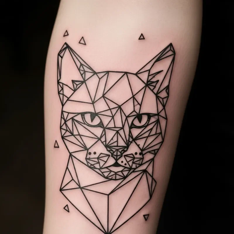 Geometric cat tattoos merge modern design aesthetics with feline forms, creating striking pieces that are equal parts art and tribute. These designs break cats down into triangles, hexagons, and other shapes, reconstructing them like beautiful puzzles. Some feature half-realistic, half-geometric cats for an intriguing contrast, while others go full geometric for a contemporary look. Popular styles include low-poly cats that look like 3D computer graphics, mandala-incorporated cats where sacred geometry meets feline form, or origami-inspired designs that appear folded from paper. The precision required makes these tattoos particularly impressive, with clean lines and perfect angles creating visual impact. Many people choose single-color designs for boldness, though strategic color placement can create stunning effects. These tattoos appeal to those who appreciate both their cats and modern art, creating conversation pieces that showcase both loves simultaneously.
