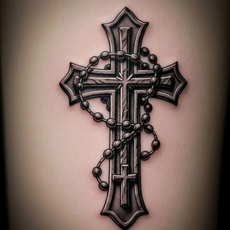 A rosary cross tattoo wraps your devotion around your body like a spiritual embrace. This design typically features rosary beads draped around or forming the cross itself, creating movement and dimension in your ink. Each bead can represent specific prayers, intentions, or loved ones you hold in your heart. You might incorporate realistic bead textures or stylized geometric shapes, depending on your aesthetic preference. Many choose to wrap rosary tattoos around wrists, ankles, or arms, mimicking how actual rosaries are worn. This design especially appeals to those raised in Catholic traditions, serving as a permanent reminder of childhood prayers and family faith.