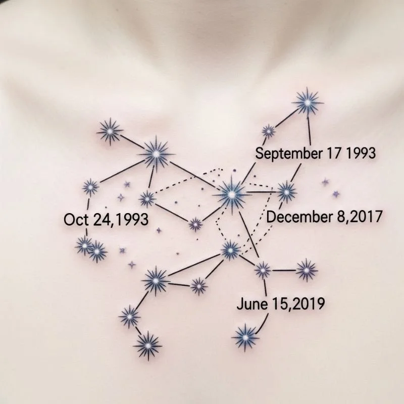 Constellation tattoos map family birthdates onto star patterns, creating celestial family portraits that connect your loved ones to the infinite cosmos above. These designs take actual star positions from significant dates and transform them into personal constellation maps that tell your family's astronomical story. Each star represents a family member's birth, with lines connecting stars to form unique patterns specific to your family. You can add dates, initials, or zodiac symbols to enhance the celestial theme. The scientific accuracy of astronomical data adds authenticity while the artistic interpretation creates beautiful, meaningful designs. Some families choose to include stars for pets, adoption dates, or other significant family milestones.