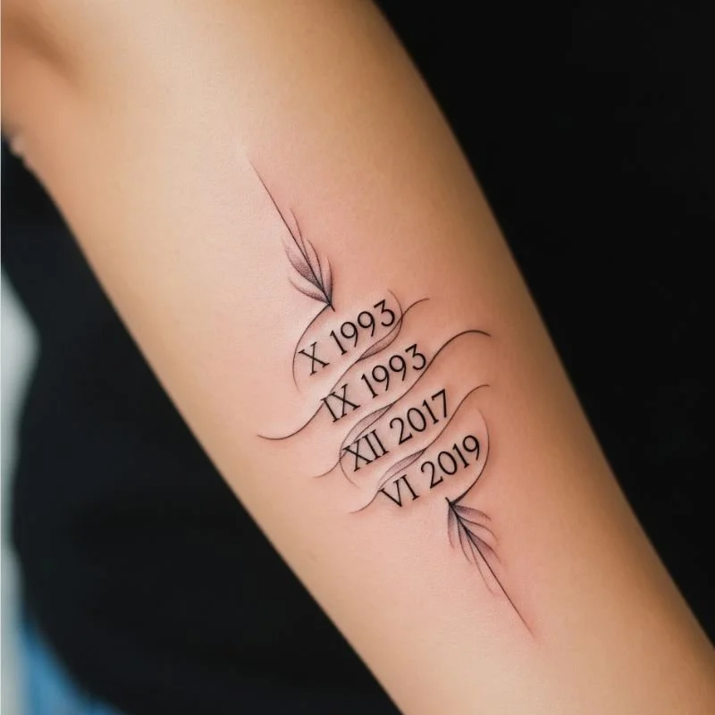 Roman numeral tattoos offer elegant, timeless ways to commemorate important family dates like birthdates, anniversaries, or memorial dates while maintaining sophisticated aesthetic appeal. The classical appearance of Roman numerals adds dignity and permanence to these meaningful dates, creating tattoos that feel both personal and historically significant. You can arrange multiple dates vertically, horizontally, or in creative patterns that incorporate decorative elements like flourishes, hearts, or infinity symbols. Some families choose to include birth dates of all children, while others commemorate wedding anniversaries or dates when family members passed away. The numeric format ensures privacy while maintaining deep personal meaning for those who understand the significance of each date.