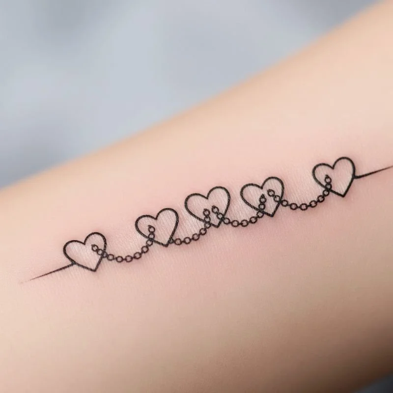 Heart chain tattoos create visual representations of emotional connections through linked heart symbols that demonstrate how family love flows between members continuously. These designs work beautifully to show the interconnected nature of family relationships while allowing for individual customization within each heart element. You can incorporate names, initials, or small symbols within each heart to represent specific family members. The chain design allows for future additions as families grow through marriage, birth, or adoption. Popular variations include hearts of different sizes to represent children and adults, colored hearts for different family branches, or hearts that transform into other meaningful symbols like infinity signs, flowers, or birds.