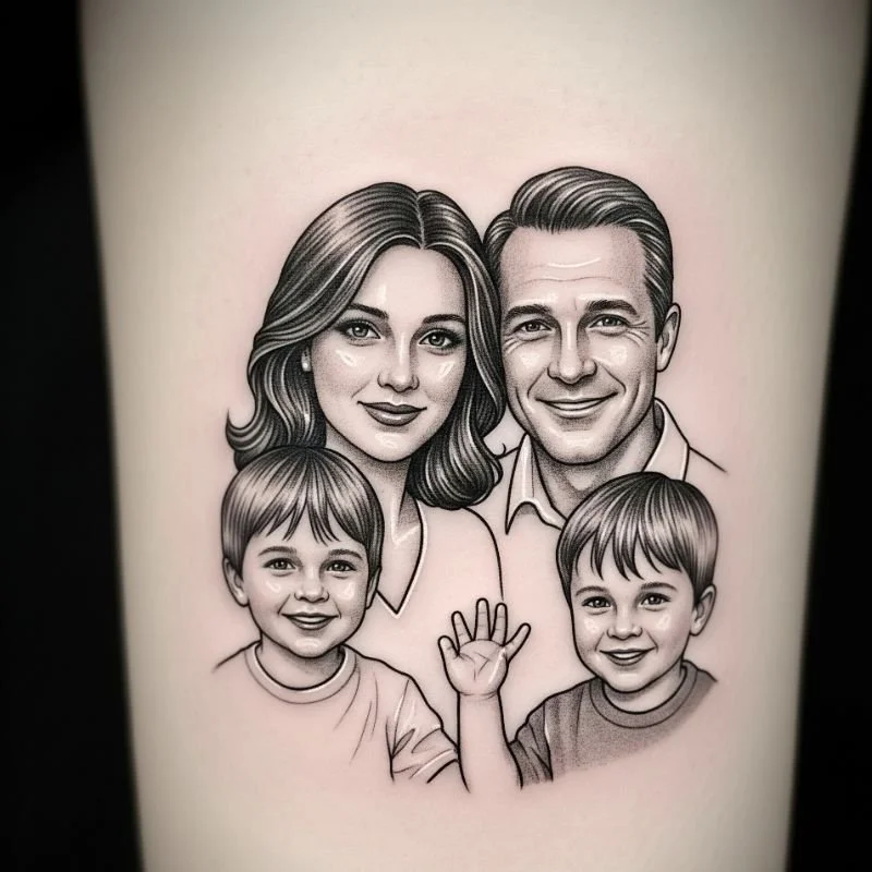 Portrait tattoos capture the physical essence of loved ones through realistic artistic representations that preserve their memory and presence in permanent form. These highly detailed tattoos require exceptional artistic skill to execute properly, but the results create powerful emotional connections and lasting tributes. You can choose single portraits of particularly significant family members or create collages featuring multiple loved ones. Black and gray realism works beautifully for classic, timeless appeal, while color portraits can capture specific eye colors, hair tones, or other distinctive features. Consider incorporating meaningful background elements like favorite flowers, landscapes, or symbols that represent shared memories or the person's interests and personality traits.
