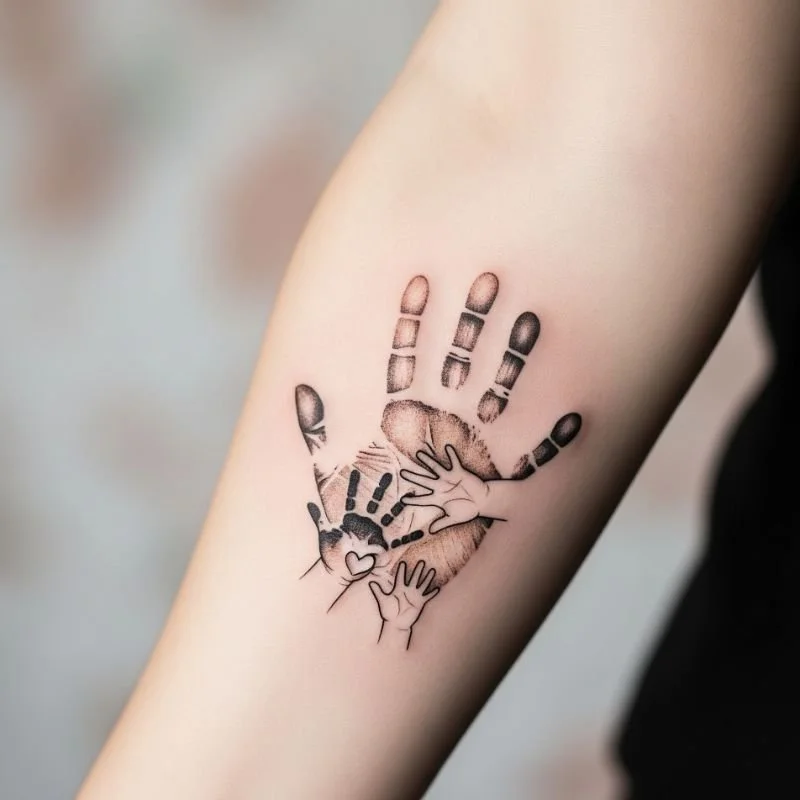 Handprint tattoos preserve precious moments of childhood and family connection through actual traced handprints that capture specific points in time beautifully. These deeply personal designs work particularly well for parents wanting to commemorate their children's small hands or for families wanting to create collaborative art pieces. You can use actual handprints traced onto transfer paper or work with artists to create stylized versions that maintain the essence while improving artistic flow. Multiple handprints can be arranged in creative patterns, overlapping designs, or family trees where handprints form leaves. Some families add names, dates, or small decorative elements to enhance the design while maintaining the authentic, personal nature of actual handprints.