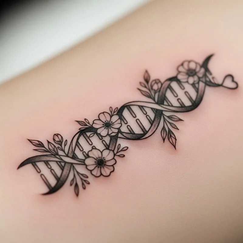 DNA helix tattoos celebrate the scientific marvel of genetic inheritance while creating visually striking designs that represent family connections at the molecular level. These modern, sophisticated designs appeal to families who appreciate the intersection of science and art while honoring biological and chosen family bonds. The double helix structure provides excellent framework for incorporating family elements like initials, birthdates, or small symbols within the spiral pattern. You can customize colors to represent different family members or use gradient effects to show generational flow. Some designs incorporate actual genetic sequencing data for families who want scientific accuracy, while others use artistic interpretation to create beautiful, meaningful patterns.