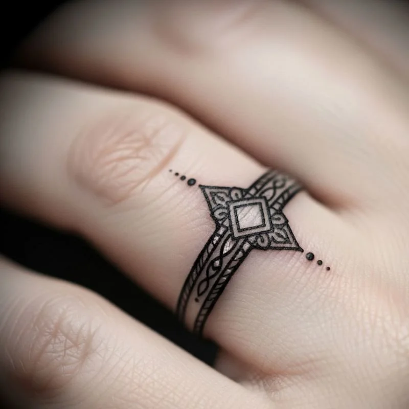 Replace traditional jewelry with permanent ring tattoos that never need removing. Simple bands offer classic elegance while detailed patterns like Celtic knots or tribal designs add personality. Some couples choose matching wedding bands tattooed instead of metal rings. Dot work creates textured effects while solid lines make bold statements. These tattoos can wrap completely around fingers or sit as partial bands. They're practical for people who can't wear traditional rings due to work or activities. Think of them as promises written in ink instead of metal.