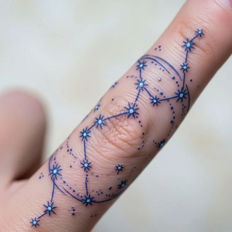 Connect the dots with constellation finger tattoos mapping your personal universe. Zodiac constellations celebrate astrological connections while other star patterns might represent family members or significant dates. These designs use tiny dots connected by thin lines, creating celestial maps on your skin. Some people choose constellations visible on meaningful nights. The minimal nature suits finger limitations while maintaining recognizable patterns. Add tiny stars or planets for extra cosmic appeal. These tattoos remind you that you're made of stardust and connected to something infinite.