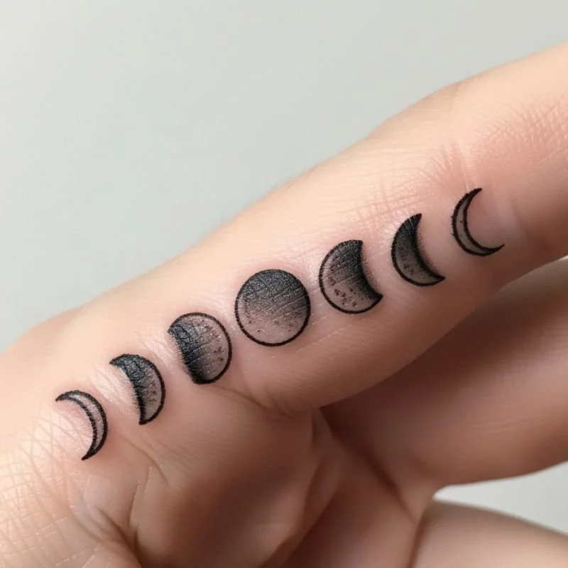 Capture lunar magic with tiny moon phase tattoos dancing across your fingers. These celestial designs can show the complete cycle from new to full moon or highlight specific phases with personal meaning. Birth moon tattoos connect you to your cosmic beginning. Minimalist crescents work for single fingers while complete cycles span multiple digits. Some designs incorporate stars or dots for added celestial appeal. The circular shapes complement finger curves naturally. These tattoos remind you that like the moon, you're constantly evolving through different phases of life.