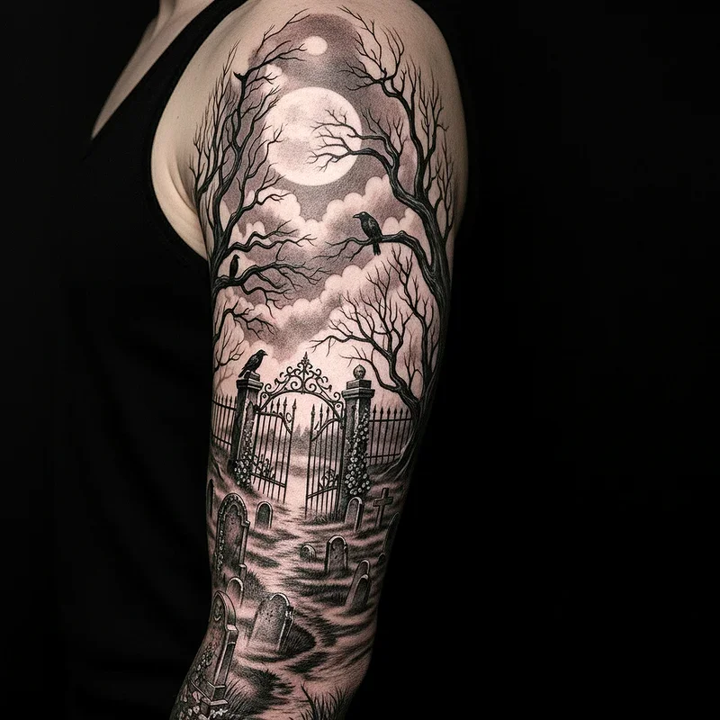 Cemetery tattoos create entire worlds of Gothic atmosphere on your skin, complete with weathered headstones, gnarled trees, and misty backgrounds. These elaborate scenes tell stories of eternal rest, forgotten souls, and the beauty found in decay. Artists layer elements like wrought iron gates, crumbling mausoleums, and overgrown ivy to create depth and atmosphere that draws viewers into the scene. You might include personal elements like specific dates or names on headstones, making the design uniquely yours. The addition of supernatural elements like ghostly figures or mysterious lights adds an otherworldly quality to these already haunting designs. These tattoos work best as larger pieces on backs, thighs, or wrapped around limbs, allowing the artist space to develop the full atmospheric potential.