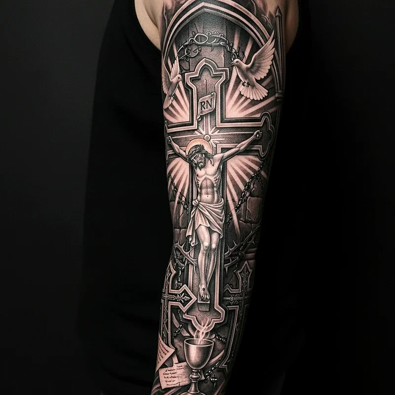 Gothic crosses blend religious iconography with dark artistic elements, creating powerful symbols that speak to both faith and rebellion. These aren't your typical crosses; they feature elaborate Celtic knotwork, thorny vines, or crumbling stone textures that give them an ancient, weathered appearance. Artists often incorporate additional elements like rosary beads, crown of thorns, or sacred hearts wrapped in barbed wire. The juxtaposition of holy symbols with darker imagery creates a tension that perfectly captures the Gothic aesthetic's relationship with Christianity. You'll find these designs ranging from simple yet elegant Celtic crosses to elaborate scenes featuring multiple religious elements. The symbolism can represent everything from questioning faith to finding beauty in religious tradition's darker aspects.