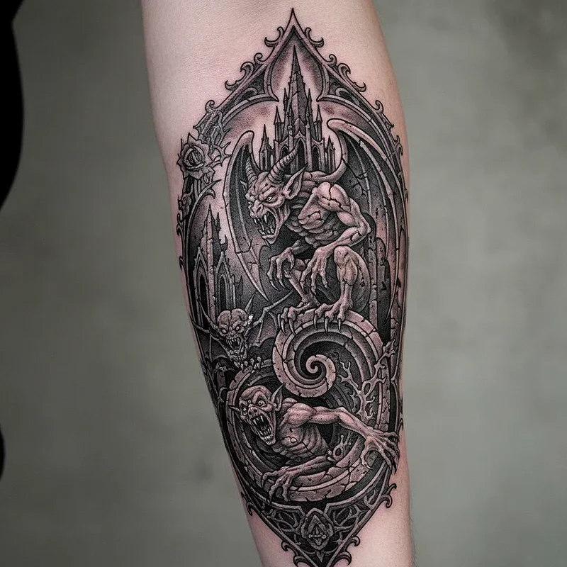 Gargoyle tattoos bring Gothic architecture's most fascinating guardians to life on your skin, their grotesque features and protective symbolism making powerful statements. These stone creatures combine human, animal, and demonic features in ways that both repel and fascinate. Artists capture the weathered stone texture, creating designs that look like they've watched over centuries of human drama. You might choose a single gargoyle perched on your shoulder or multiple grotesques forming a protective barrier across your back. The addition of architectural elements, weather effects, or Gothic cityscapes provides context for these guardian creatures. These tattoos represent protection from evil, the beauty in monstrous forms, and the Gothic tradition of finding comfort in creatures others fear.