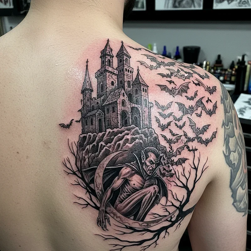 Bats and vampire imagery tap into Gothic culture's fascination with creatures of the night and immortal beings who exist outside conventional society. These designs range from realistic bat colonies swirling across your skin to stylized vampire portraits with fangs and hypnotic eyes. Artists create movement in bat tattoos through varying sizes and positions, making it appear as though the colony erupts from your body. Vampire designs might include classic Dracula imagery, modern interpretations, or abstract representations using fangs, blood drops, and Gothic romance elements. The addition of full moons, castle silhouettes, or Victorian elements enhances the vampiric atmosphere. These tattoos appeal to those who identify with outsider culture and find beauty in creatures typically associated with fear and darkness.
