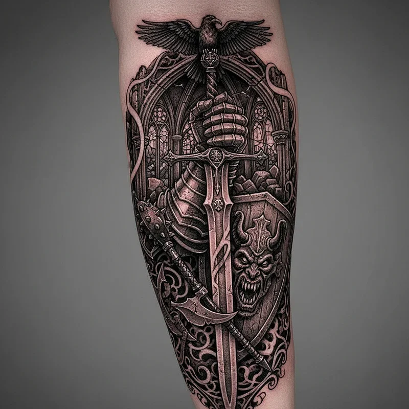 Medieval armor and weapon tattoos connect you to the Gothic period's warrior culture and the romanticized violence of chivalric tales. These designs feature intricately detailed gauntlets, helmets with mysterious shadows where faces should be, or crossed swords with ornate hilts. Artists recreate the texture of metal through careful shading, making armor pieces appear three-dimensional and battle-worn. You might choose a full suit of armor breaking apart to reveal darkness beneath, or focus on specific pieces like a knight's helmet surrounded by roses. The addition of heraldic symbols, Latin mottos, or battle damage tells stories of forgotten warriors and lost causes. These tattoos appeal to those who find nobility in darkness and strength in Gothic warrior traditions.