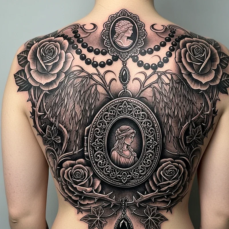 Victorian mourning jewelry tattoos bring the elaborate grief customs of the 19th century to life on your skin. These designs recreate the intricate cameos, lockets, and memorial rings that Victorians wore to honor their deceased loved ones. Artists incorporate elements like woven hair patterns, forget-me-nots, weeping willows, and ornate frames that capture the period's obsession with memento mori. You'll often see these tattoos featuring portrait silhouettes surrounded by delicate filigree work and black gemstone settings. The level of detail required makes these pieces true works of art that celebrate both beauty and sorrow. Adding personal touches like dates or initials transforms these historical designs into deeply meaningful tributes that speak to your own experiences with loss and remembrance.