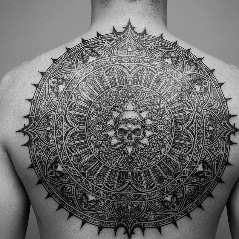 Gothic mandalas merge sacred geometry with dark symbolism, creating mesmerizing patterns that draw the eye inward while incorporating Gothic elements. These circular designs feature skulls, bats, thorns, and Gothic architectural details arranged in perfect symmetry. Artists use precise line work and dotwork techniques to create intricate patterns that seem to pulse with dark energy. You might choose mandalas that incorporate pentacles, Gothic crosses, or occult symbols within their geometric patterns. The meditative quality of mandala designs combined with Gothic imagery creates tattoos that serve as both spiritual tools and artistic statements. These designs work beautifully as centerpieces for larger Gothic compositions or as standalone pieces that showcase the mathematical precision found in Gothic art and architecture.