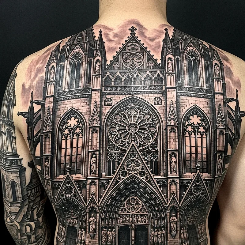 Gothic cathedral tattoos transform your body into a walking monument to architectural mastery and spiritual darkness. These designs feature towering spires, pointed arches, and intricate rose windows that capture the grandeur of medieval Gothic churches. Artists skillfully recreate the detailed stonework, flying buttresses, and ornate facades that make these structures so hauntingly beautiful. You'll find these tattoos often incorporate elements like gargoyles perched on corners or ravens circling the towers. The play of light and shadow in these designs creates an almost three-dimensional effect that draws the eye upward. Whether you choose Notre-Dame's iconic silhouette or create a fantasy cathedral of your own imagination, these tattoos make powerful statements about faith, history, and the sublime beauty of Gothic architecture.