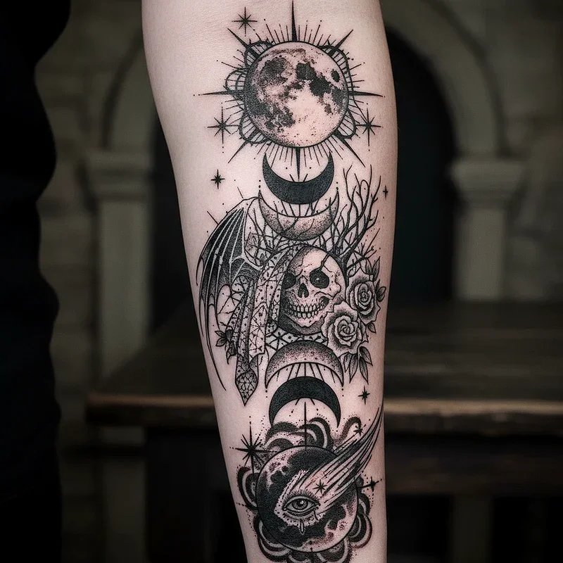Celestial Gothic tattoos harness the mysterious power of night skies, featuring moon phases, constellation patterns, and cosmic symbolism viewed through a dark lens. These designs often incorporate crescent moons cradling skulls, full moons illuminating Gothic scenes, or entire lunar cycles decorated with occult symbols. Artists use dotwork and negative space to create ethereal effects that make celestial bodies appear to glow against your skin. You might include elements like moths drawn to moonlight, nocturnal flowers that bloom under stars, or astrological symbols with Gothic interpretations. The connection between celestial bodies and Gothic culture runs deep, representing cycles of death and rebirth, the power of darkness, and humanity's eternal fascination with forces beyond our control.