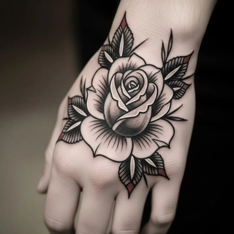 Traditional rose tattoos bring classic beauty and romantic symbolism to hand placements, creating vintage-inspired designs that never go out of style regardless of changing trends. These iconic flowers work beautifully across knuckles, wrapping around fingers, or positioned on the back of hands where their organic shapes complement natural bone structure. Bold outlines and solid color fills ensure these designs maintain their visual impact despite the challenges of hand tattooing. You can customize roses with different colors for various meanings: red for passion, white for purity, black for loss, or yellow for friendship. Thorns, leaves, and decorative elements add complexity while maintaining the classic traditional tattoo aesthetic that honors tattooing history.