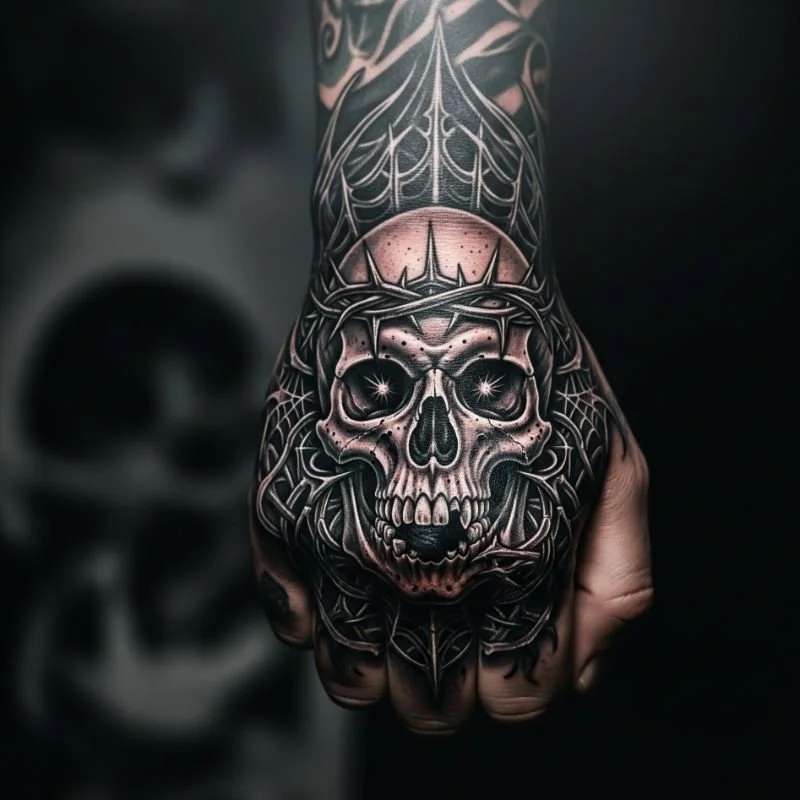 Skull tattoos embrace dark aesthetic themes while creating striking visual statements that challenge conventional beauty standards and celebrate alternative culture expressions. These powerful symbols work beautifully on hands where their dramatic impact creates instant conversation starters and bold personal statements. Sugar skulls offer colorful, decorative alternatives to traditional skull imagery, incorporating flowers, patterns, and vibrant colors that celebrate life while acknowledging mortality. Gothic elements like ravens, crosses, thorns, or architectural details enhance the dark romantic aesthetic. The contrast between delicate hand anatomy and powerful dark imagery creates compelling visual tension that appeals to those who appreciate gothic beauty and alternative artistic expressions.