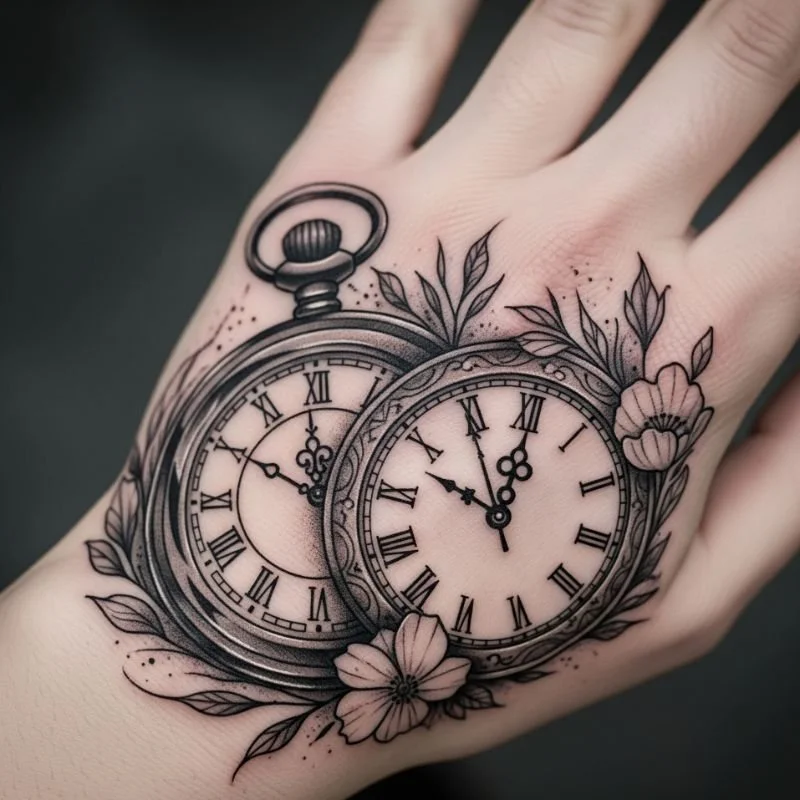 Timepiece tattoos create sophisticated vintage aesthetic statements while symbolizing the passage of time, important moments, or the value of living in the present moment. Pocket watches, clock faces, gears, and mechanical elements work beautifully on hands where their circular shapes complement natural palm contours and finger curves. You can customize clock faces to show significant times, incorporate Roman numerals for classical appeal, or add gears and mechanical details for steampunk aesthetics. These designs appeal to those who appreciate vintage craftsmanship, mechanical beauty, and philosophical concepts about time's role in human experience. The intricate details create visually interesting compositions that reward closer examination while making bold statements about personal style.