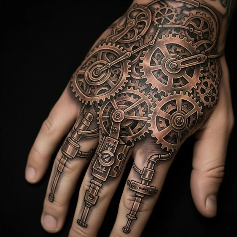 Steampunk tattoos embrace industrial aesthetic themes through mechanical elements that transform hands into intricate machinery displays celebrating the intersection of technology and artistry. Gears, pistons, clockwork mechanisms, and Victorian-era industrial elements create complex compositions that reward detailed examination. These designs appeal to those who appreciate mechanical craftsmanship, vintage technology, and alternative aesthetic movements that blend historical and futuristic elements. The metallic appearance can be enhanced through shading techniques that create depth and dimension, making mechanical elements appear to exist beneath skin surface. However, the intricate details require exceptional artistic skill and may require touch-ups over time to maintain crisp mechanical precision.