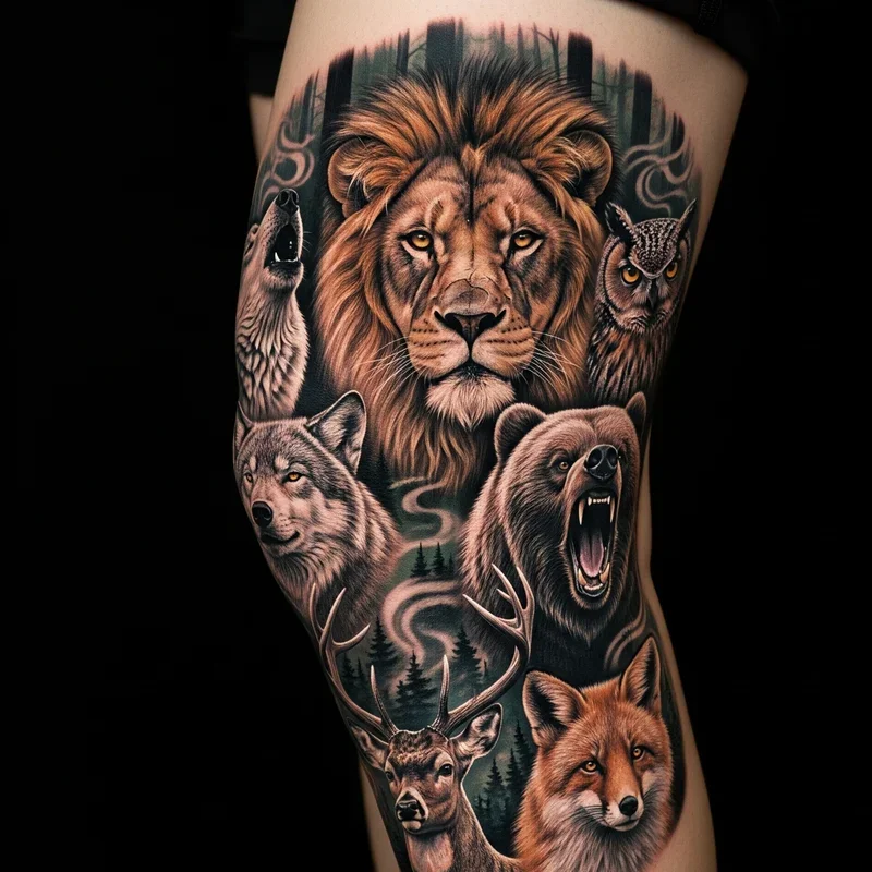 Express your spirit animal literally by placing its portrait right on your knee where everyone can see it. Whether you connect with the fierce loyalty of a wolf, the wisdom of an owl, or the strength of a lion, animal portraits on knees create powerful statements about who you are. The key to a successful animal portrait knee tattoo lies in choosing an artist who specializes in realism or neo-traditional styles. The face should be centered on the kneecap, with features like manes, feathers, or fur extending naturally around the joint. Black and gray realism creates stunning depth and texture, while neo-traditional adds bold colors and stylized elements. Consider how the animal's expression will look when your knee bends; a snarling tiger might look even more fierce in motion. These tattoos often become conversation starters, letting you share the story of why that particular creature speaks to you.