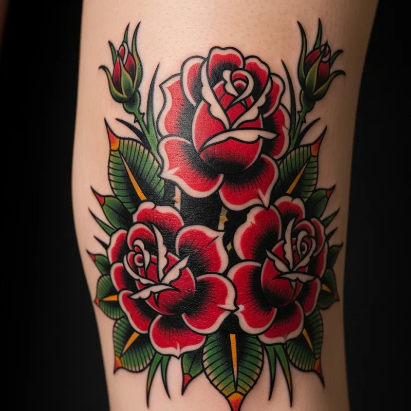 Nothing screams classic tattoo culture quite like a bold, traditional rose centered right on your kneecap. These timeless designs pack a punch with their vibrant reds, deep greens, and bold black outlines that refuse to be ignored. The rose's natural circular bloom mirrors the knee's shape perfectly, while leaves and thorns can trail elegantly down your shin or wrap around toward your thigh. Traditional roses carry deep symbolism too; they represent love, beauty, and the balance between pleasure and pain (fitting for a knee tattoo, right?). Artists love working with this design because it allows for creative freedom in size and detail level. You might opt for a single, statement rose or create a bouquet effect with multiple blooms. The thick, bold lines characteristic of traditional tattooing age beautifully, ensuring your knee art looks just as striking decades from now.
