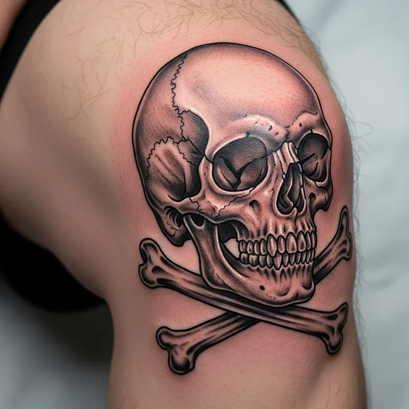 Want to make a statement that says you're not afraid of anything, including tattoo pain? A skull and crossbones on your knee delivers that message loud and clear. This classic design has decorated the knees of rebels, pirates, and punk rockers for generations, and it's not going anywhere soon. The skull sits perfectly on the kneecap, grinning at anyone who dares to look, while crossbones extend outward creating an X that frames the joint. Modern artists put fresh spins on this traditional concept by adding roses growing through eye sockets, geometric patterns within the bone structure, or realistic shading that makes the skull appear three-dimensional. Some incorporate Day of the Dead elements with colorful flowers and decorative patterns. The boldness of this design means it works best in larger sizes where details like teeth and bone texture really shine through.