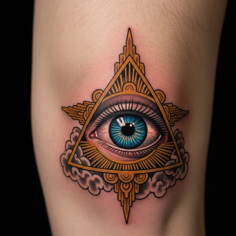 Transform your knee into an all-seeing eye that watches the world with every step you take. The Eye of Providence, often shown within a triangle with radiating light beams, creates a powerful and mystical focal point on your kneecap. This symbol carries deep meaning across cultures, representing divine providence, spiritual awakening, or simply the idea of staying aware and vigilant. The eye itself sits perfectly on the rounded surface of the knee, while the triangle and rays extend outward creating a balanced composition. Artists can approach this design in various styles; hyperrealistic eyes with intricate iris details and realistic tears, traditional bold designs with simple but striking imagery, or geometric interpretations using dotwork and linework. Some people add decorative elements like clouds, stars, or ornamental patterns around the triangle. The result is a tattoo that seems to look back at anyone who looks at it.