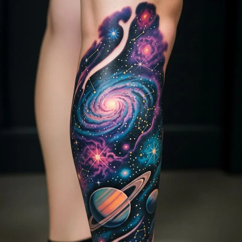 Launch your leg into the cosmos with a galaxy-themed tattoo that captures the universe's infinite beauty. Swirling nebulas, distant stars, and colorful planets transform your skin into a portal to space. This style allows for incredible creativity, blending realistic astronomical elements with artistic interpretation. The leg's length provides ample space for creating depth, making distant galaxies appear to recede into your skin. Add personal touches like constellation patterns or meaningful celestial bodies to make the design uniquely yours.