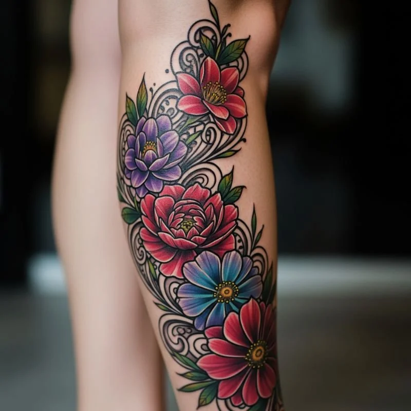 Who says tattoos need harsh outlines? Watercolor floral designs on your calf bring a soft, artistic touch to body art. Imagine vibrant peonies bleeding into purples and pinks, or delicate wildflowers that look like they've been painted directly onto your skin. This style breaks traditional tattoo rules, embracing fluidity and movement. The calf's shape perfectly showcases cascading flowers, creating an effect that's both feminine and fierce. It's like carrying a piece of impressionist art wherever you go, proving that tattoos can be as gentle as they are bold.