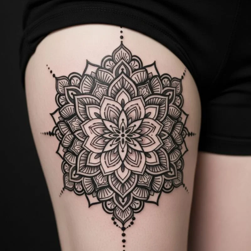 Your thigh offers the perfect canvas for a stunning geometric mandala design. These intricate patterns combine sacred geometry with personal meaning, creating a piece that's both visually striking and spiritually significant. The circular nature of mandalas works beautifully with the thigh's curved surface, allowing the design to flow naturally with your body. Whether you prefer dotwork, fine lines, or bold blackwork, mandala tattoos adapt to any style preference. They're like wearing a permanent piece of meditative art that grounds you every time you catch a glimpse of it.