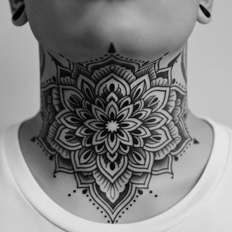 The mandala throat centerpiece creates a mesmerizing focal point that draws eyes directly to your neck's center with intricate geometric precision. This circular design represents spiritual wholeness and cosmic balance while showcasing incredible artistic detail that demands close examination. Artists position these pieces strategically at the throat's base, where the design's symmetry complements your natural anatomy perfectly. The mandala's radiating patterns create visual depth that appears to pulse with energy and movement from every viewing angle. Detailed line work and dot shading techniques transform simple geometric shapes into complex spiritual artwork that reflects inner peace and personal growth. This placement requires absolute commitment since throat tattoos remain visible in most clothing choices and professional settings.