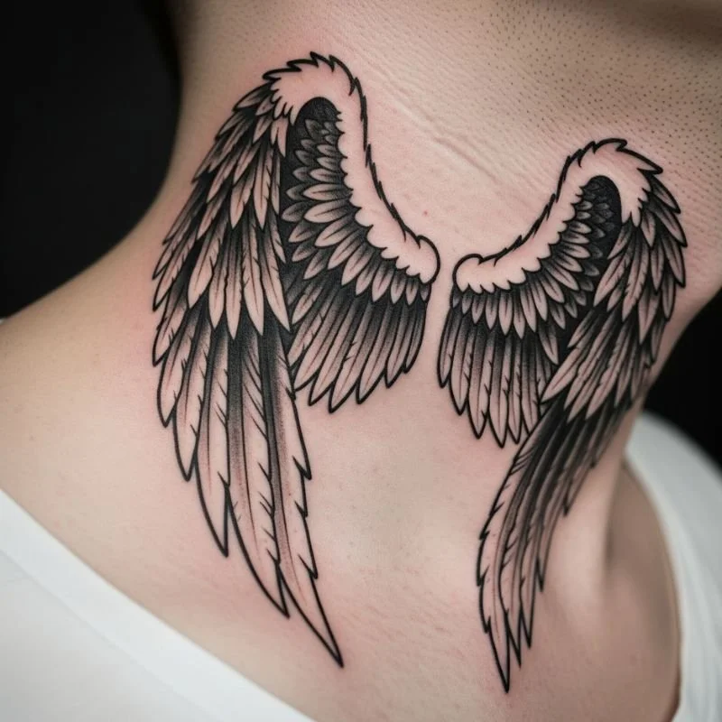 Angel wing neck tattoos create heavenly symbolism that spreads across your neck's width, suggesting divine protection and spiritual guidance. These designs position wings symmetrically, creating balance that enhances your neck's natural proportions while adding ethereal beauty. The feather details require incredible artistic skill to achieve realistic texture and movement that makes wings appear capable of flight. Shading techniques create depth and dimension that transforms flat artwork into three-dimensional illusions of actual angelic appendages. Size variations accommodate different comfort levels, from subtle suggestions of wings to bold statements that dominate your neck's appearance. This design appeals to individuals seeking spiritual symbolism and protection while maintaining artistic beauty and personal significance.