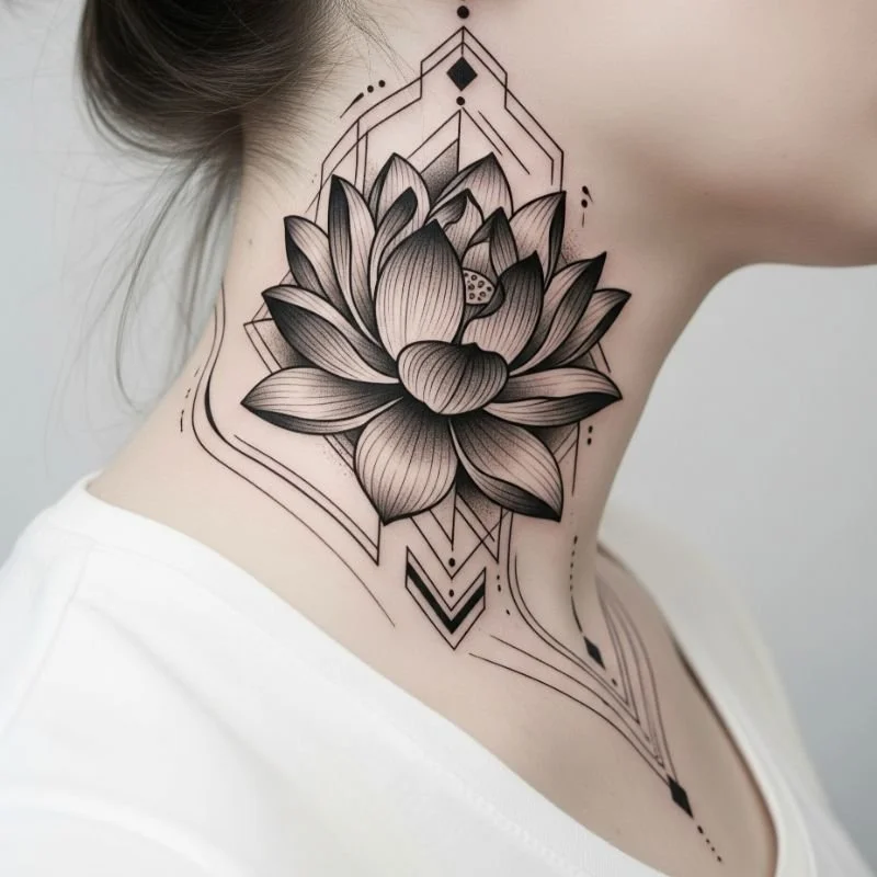 Lotus bloom centerpieces create spiritual statements that position sacred flowers at your throat's center, symbolizing purity, enlightenment, and rising above difficulties. This design draws from Eastern philosophy where lotus flowers represent spiritual awakening and the soul's journey toward perfect understanding. The flower's layered petals allow for incredible detail work that creates depth and realistic beauty worthy of meditation and contemplation. Color options range from traditional pink and white to artistic interpretations using blues, purples, or gradient techniques that enhance visual appeal. The centered placement creates balance and symmetry that complements your neck's natural proportions while maintaining spiritual significance and artistic beauty. This meaningful choice appeals to individuals seeking spiritual symbolism and those who appreciate botanical art with deeper philosophical connections.