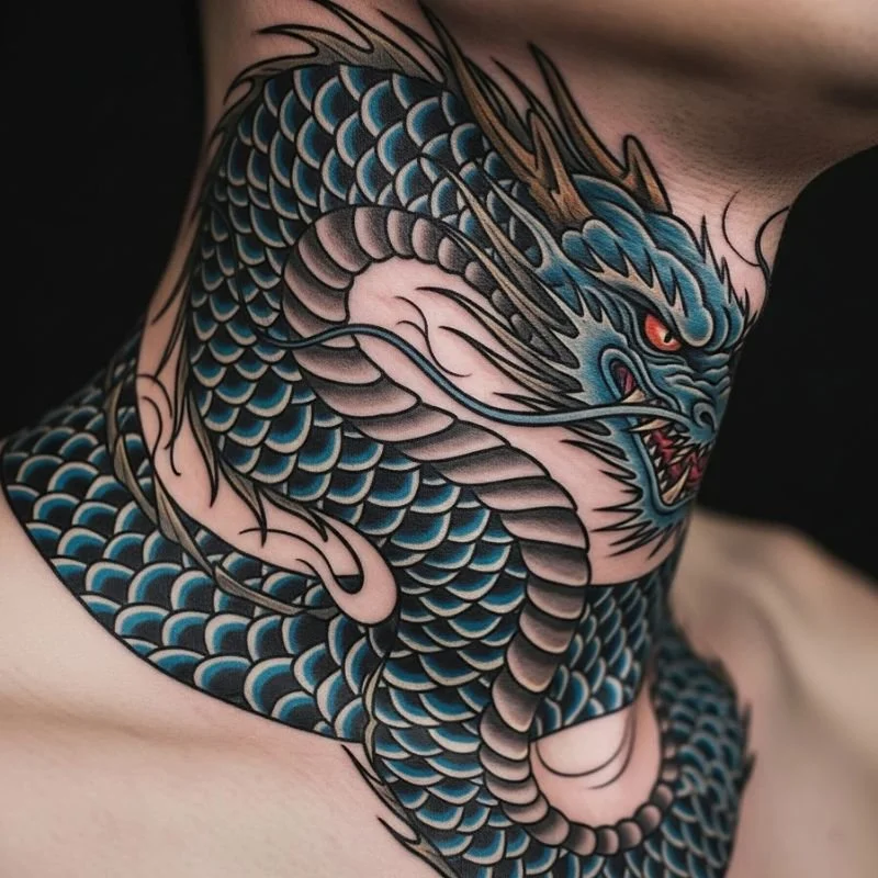 Ascending dragon designs create powerful vertical movement that draws the eye upward while symbolizing strength, wisdom, and rising above challenges. These mythical creatures wrap around your neck's side, creating dynamic composition that appears to climb toward your head. The dragon's serpentine body follows natural neck contours perfectly, allowing for seamless integration between artwork and anatomy that appears naturally placed. Traditional Asian styling incorporates scales, claws, and flowing whiskers that add incredible detail and cultural authenticity to the design. Artists can customize dragon expressions from fierce and intimidating to wise and benevolent, reflecting your personal interpretation of power. This bold choice appeals to individuals who embrace their inner strength and want to project confidence through mythical symbolism.