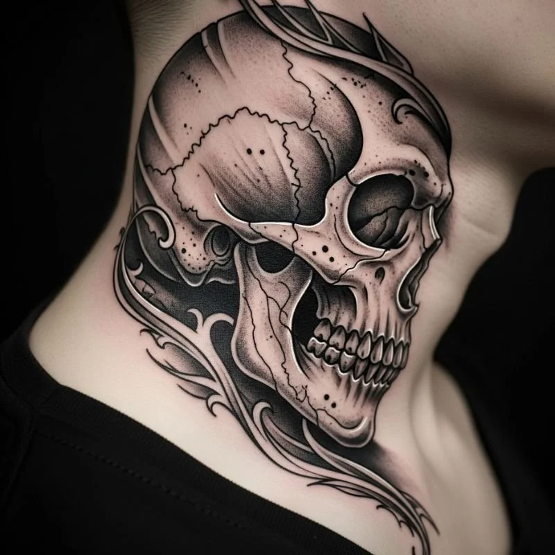 Side-placed skull profiles create dramatic gothic statements that embrace mortality's reality while showcasing artistic skill and alternative aesthetic preferences. This placement allows for detailed bone structure rendering that highlights the skull's anatomical complexity and natural beauty. The profile angle creates visual interest while maintaining artistic sophistication that elevates the design beyond simple shock value. Artists can incorporate additional elements like roses, crowns, or decorative patterns that add personal meaning and visual complexity. Shading techniques create realistic depth that makes the skull appear three-dimensional and lifelike despite representing death and transformation. This bold design appeals to individuals who appreciate gothic aesthetics and philosophical contemplation about life's precious and finite nature.