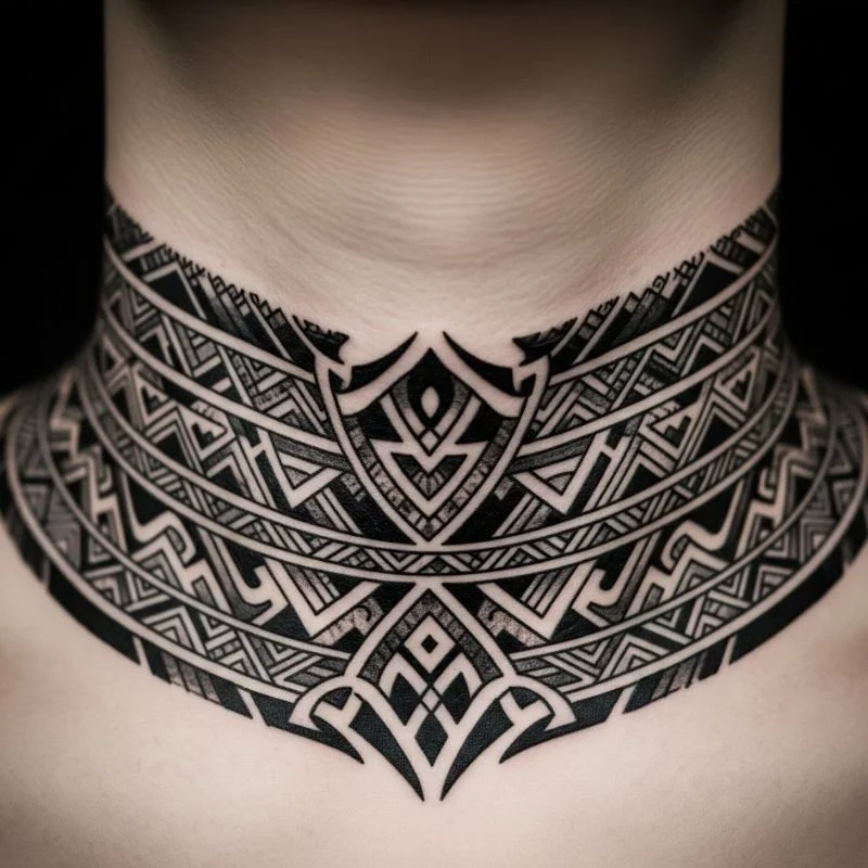 Tribal band tattoos encircle your neck completely, creating bold statements that honor ancient cultural traditions through geometric patterns and symbolic meaning. These designs draw inspiration from Polynesian, Maori, and other indigenous cultures that used body art for spiritual and social significance. The band's continuous flow around your neck creates visual unity and strength that appears to protect and empower the wearer. Traditional patterns incorporate elements representing family, strength, journey, and connection to ancestral wisdom that transcends time and culture. Modern interpretations blend traditional motifs with contemporary styling that respects cultural origins while allowing personal expression. This powerful choice appeals to individuals who value cultural heritage and want to honor traditional body art practices.