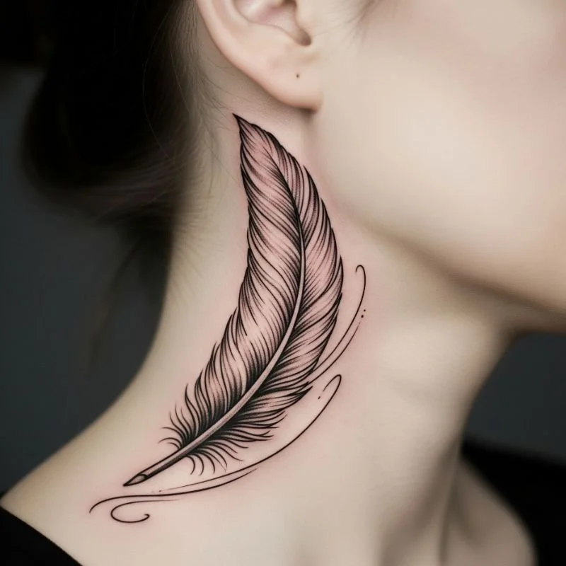 Upward-floating feather tattoos symbolize freedom, spiritual ascension, and the lightness of being that comes from releasing earthly burdens and concerns. This vertical design creates elegant movement that draws eyes upward while suggesting grace and natural beauty in motion. The feather's delicate structure allows for incredible detail work that showcases individual barbs, natural curves, and realistic texture that appears touchable. Artists can incorporate subtle color gradients or maintain classic black and gray styling that emphasizes form and movement over chromatic impact. Placement options include side neck positioning that follows natural curves or centered placement that creates symmetrical balance. This design appeals to free spirits who value independence and want to express their desire for spiritual and personal liberation.