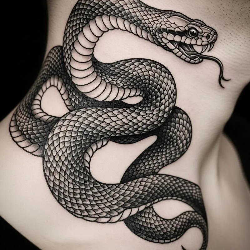 Coiling snake tattoos create dynamic movement that wraps around your neck with predatory grace and hypnotic visual flow that commands attention. These designs symbolize transformation, healing, and the cyclical nature of life through the snake's natural shedding and renewal process. The serpent's sinuous body follows your neck's contours perfectly, creating seamless integration that appears naturally placed rather than artificially applied. Scale patterns require meticulous attention to detail that showcases artistic skill while creating realistic texture and visual depth. Artists can vary snake species from realistic rattlesnakes to mythical serpents that incorporate fantasy elements and personal symbolism. This powerful design appeals to individuals who embrace change and want to project confidence through ancient symbols of wisdom and transformation.