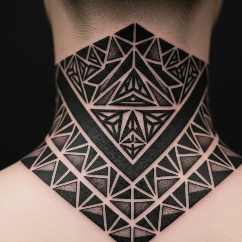 Geometric triangle patterns create modern, mathematical precision that appeals to individuals who appreciate clean lines and contemporary artistic expression. These designs use triangular shapes in various sizes and arrangements to create visual rhythm and movement across your neck's surface. The stark contrast between sharp angles and your neck's soft curves creates compelling visual tension that catches attention immediately. Artists can incorporate negative space, gradient shading, or dot work techniques that add depth and sophistication to simple geometric forms. Color variations range from solid black to subtle gradients that create three-dimensional illusions within the flat design. This style appeals to minimalists who want maximum impact through carefully calculated artistic precision rather than complex imagery.