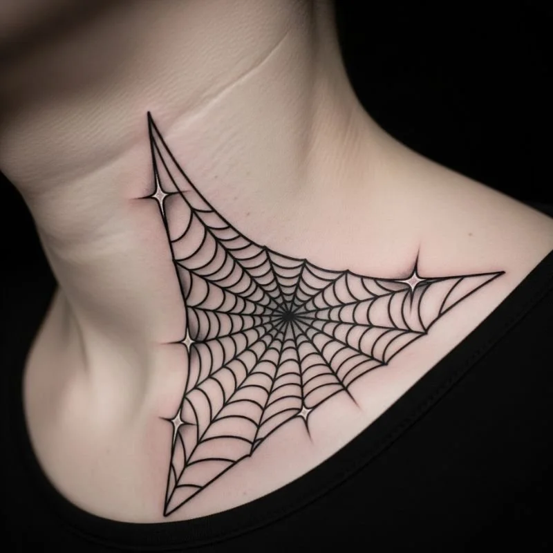 Spider web corner tattoos create edgy, alternative artwork that positions intricate web patterns at strategic neck angles for maximum visual impact. This design traditionally symbolizes being trapped by circumstances or overcoming life's sticky situations with determination and resilience. The web's radiating lines create natural geometry that complements your neck's angular transitions and bone structure perfectly. Artists achieve stunning realism through careful attention to web strand thickness, spacing, and the subtle curves that make webs appear naturally constructed. Additional elements like dewdrops or small spiders add detail and personality that personalizes the otherwise traditional design. This bold choice appeals to individuals who embrace alternative culture and want artwork that reflects their rebellious spirit.